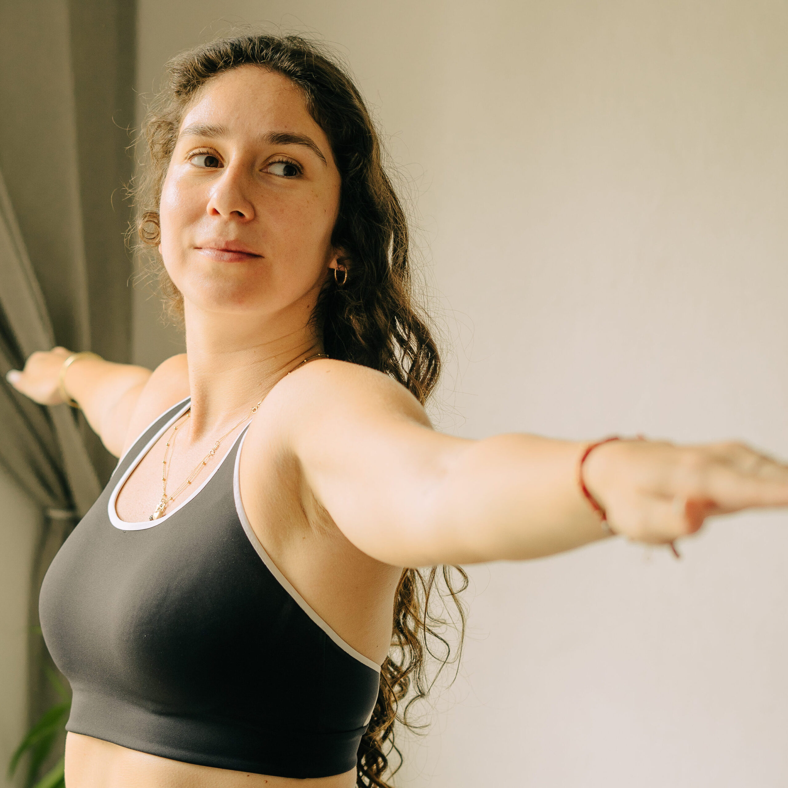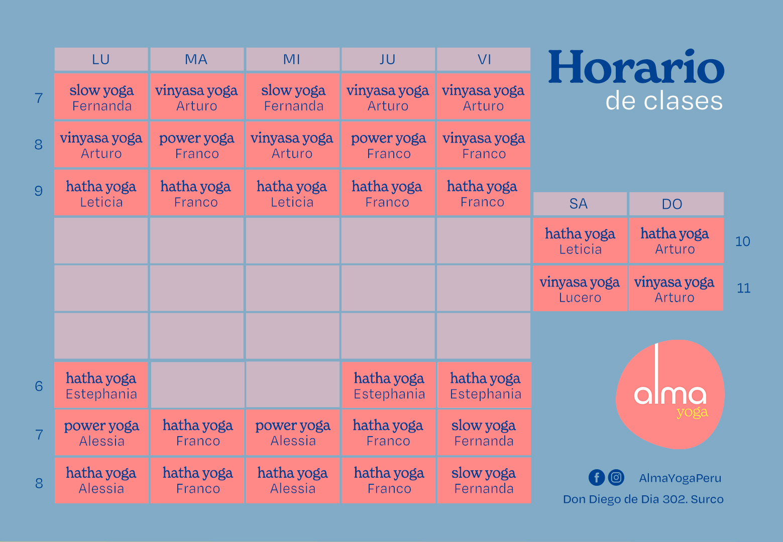 Desde el 2022, enseño en Alma Yoga, y me encanta poder enseñar en el lugar donde aprendí, siento que se completa un círculo. Dicto principalmente clases de Vinyasa, algunas desde muy temprano. Siento que el Vinyasa es ideal para las mentes hiperactivas, porque te reta a mantenerte en equilibrio en la fluidez de los asanas. Además que te ayuda a botar mucho del estrés que tenemos guardado en mente y cuerpo por su dinámica que nos hace sudar todo lo malo.